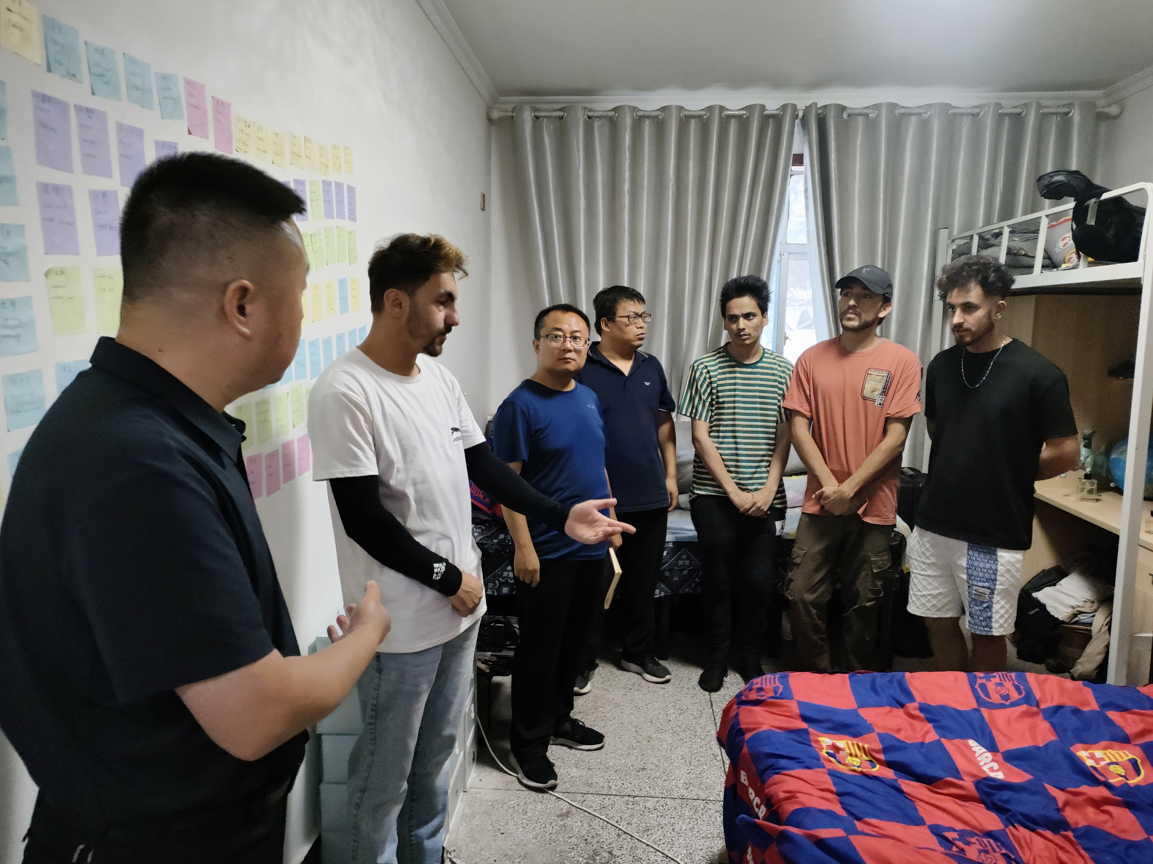 在新學(xué)期開(kāi)學(xué)之際,國(guó)際合作交流處負(fù)責(zé)人帶領(lǐng)部門(mén)全體教師深入留學(xué)生宿舍,開(kāi)展安全衛(wèi)生專(zhuān)項(xiàng)檢查,實(shí)地了解留學(xué)生開(kāi)學(xué)準(zhǔn)備情況。